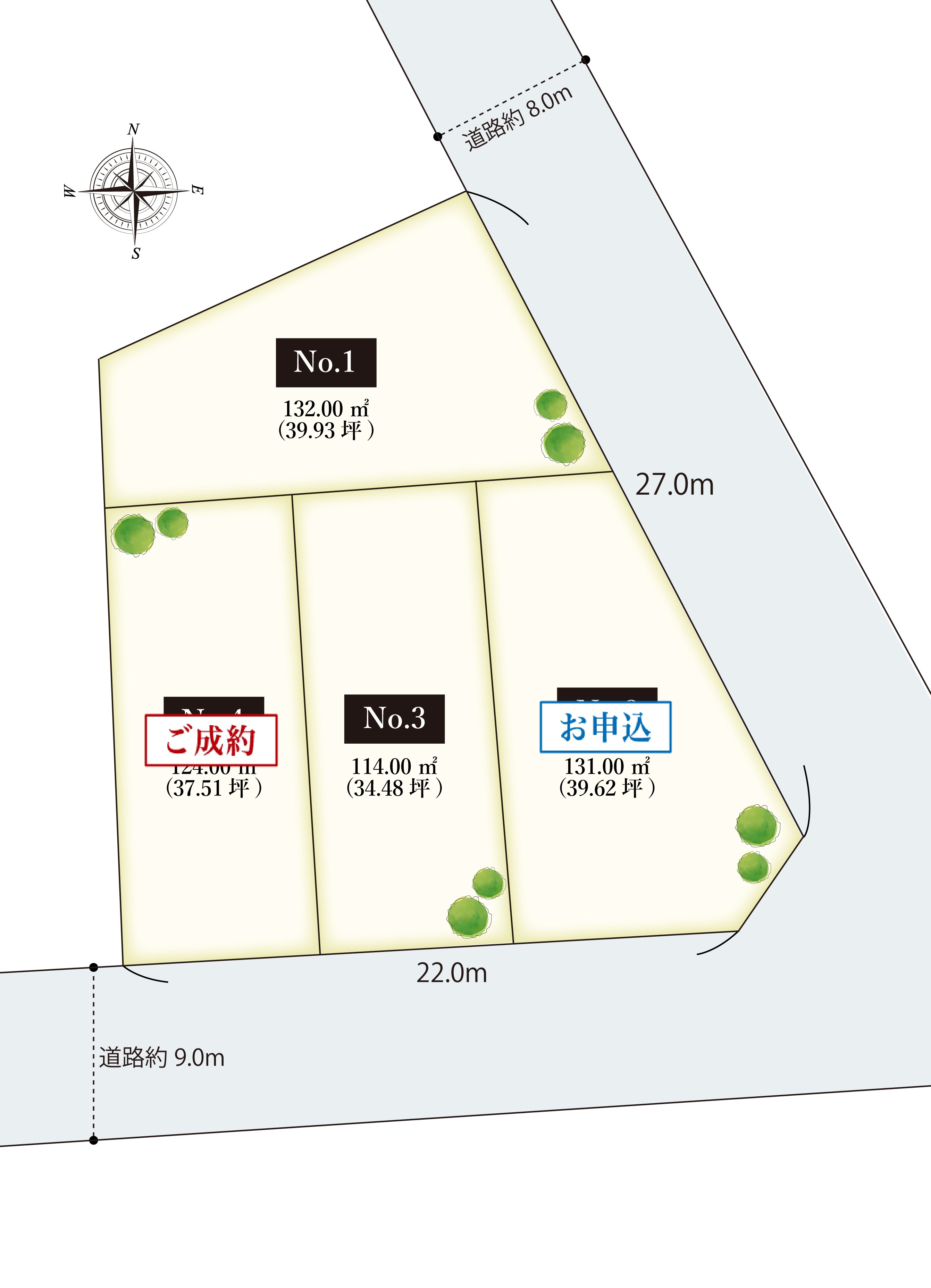 | 区画 | 敷地面積 | 建物延床面積 | 間取 | 販売価格 | 成約状況 |