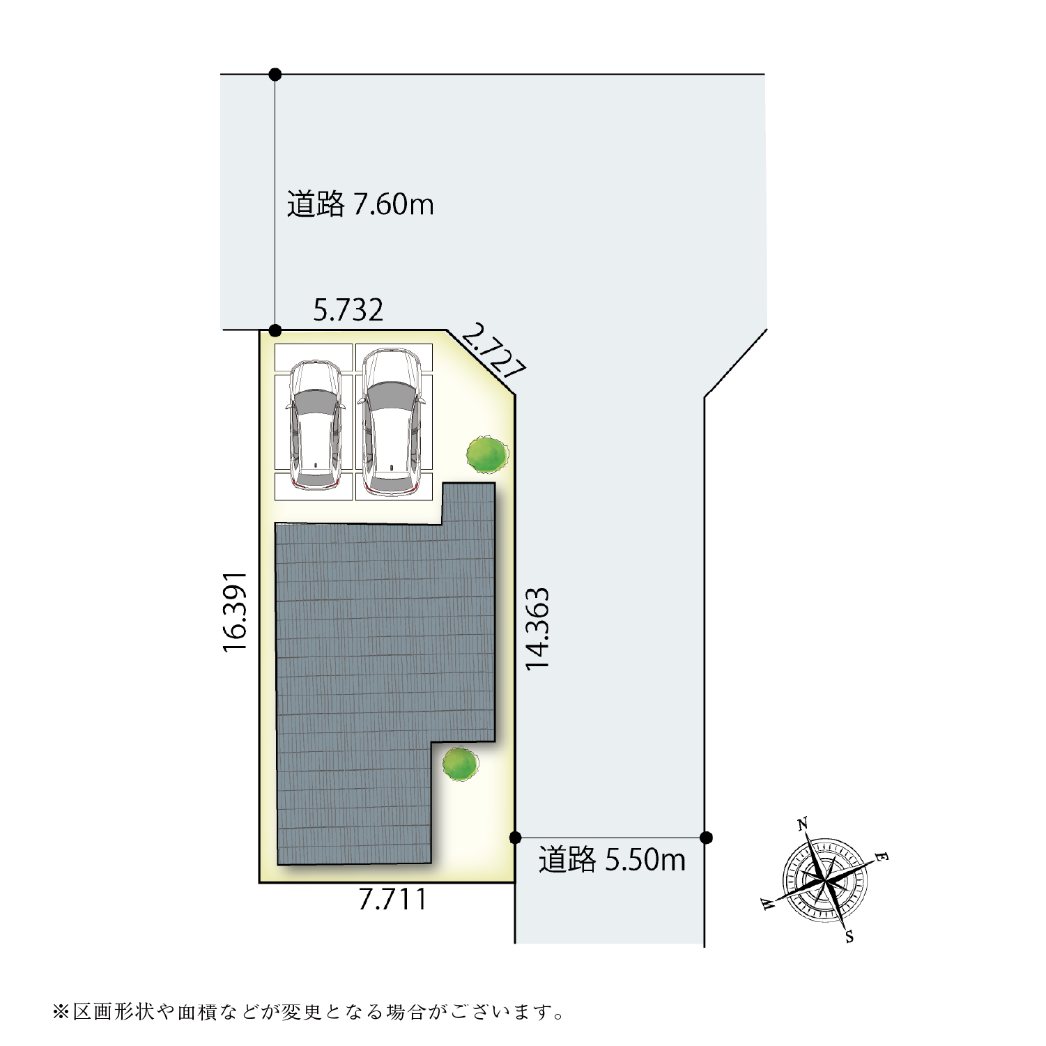 | 道路幅員 | 北側約7.6m(間口約8m)、東側約5.5m(間口約13m)※北側間口には隅切部分を含みます。 |
