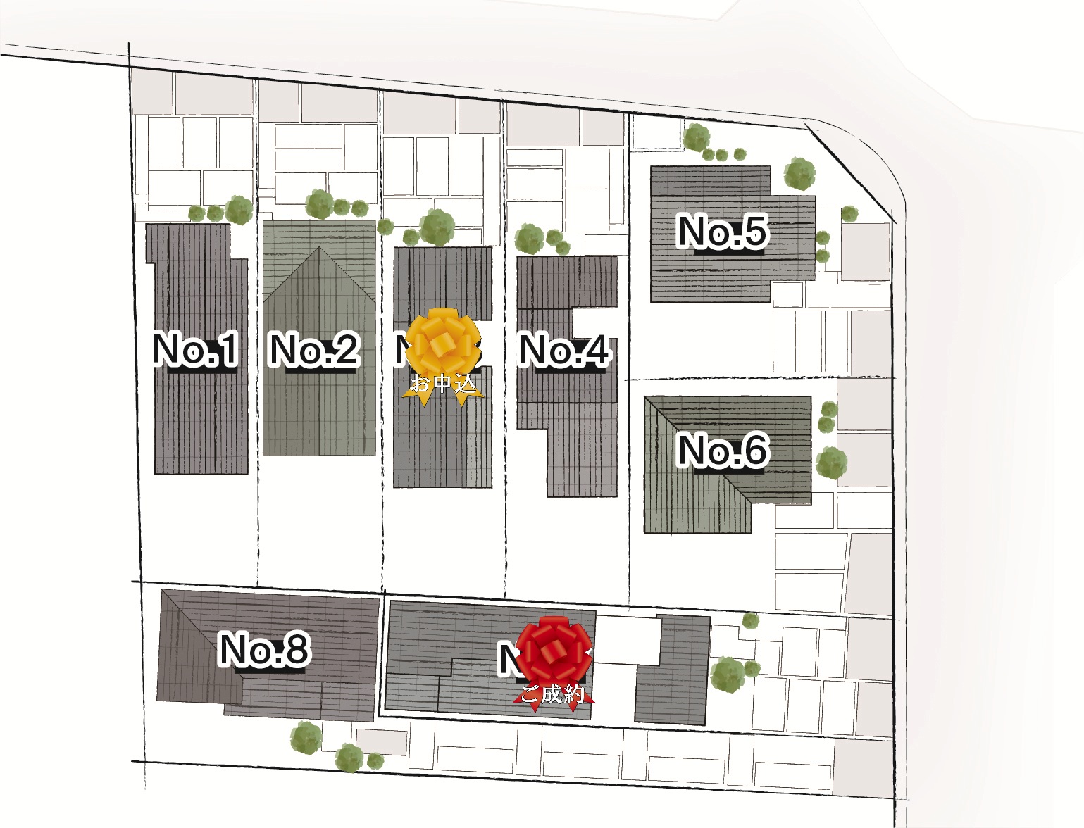 | 8 | 193.32㎡(58.47坪) | 112.21㎡(33.94坪) | 4LDK+WIC | 3,898万円 |